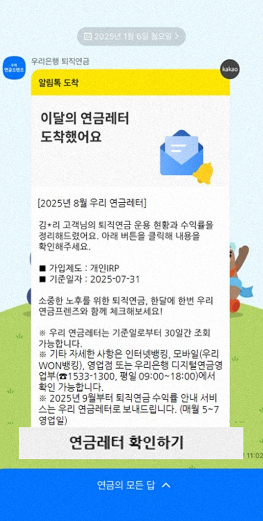 우리은행이 고객의 효율적인 퇴직연금 자산관리를 위해 카카오 알림톡을 활용한 스마트 안내장 서비스 ‘우리 연금레터’를 시행한다고 지난 8월 11일 밝혔다. 스마트 안내장 서비스를 통해 제공되는 ‘우리 연금레터’는 우리WON뱅킹 앱 설치 없이도 생년월일을 입력하는 간편한 인증절차만으로 고객의 퇴직연금 자산 현황을 카카오 알림톡으로 편리하게 확인할 수 있는 서비스로 이달 체크와 수익·운용 정보로 구성되어 있다. 먼저 ‘이달 체크’에서는 △자동이체 △상품 만기 △입금예정상품 안내 △현금성자산 운용 △디폴트옵션 안내 등 5종의 고객 맞춤형 알림과 월별 거래 이력이 요약된 자료를 제공해 준다. 특히, 고객별 알림은 우리WON뱅킹과 연동되어 자동이체 연장, 운용상품 만기 예약, 보유 상품 변경 등을 간편하게 처리할 수 있다. 또한, ‘수익·운용 정보’에서는 △수익률 변동 추이 △자산 운용현황 등 고객의 연금 자산을 그래프를 통해 직관적으로 보여준다.