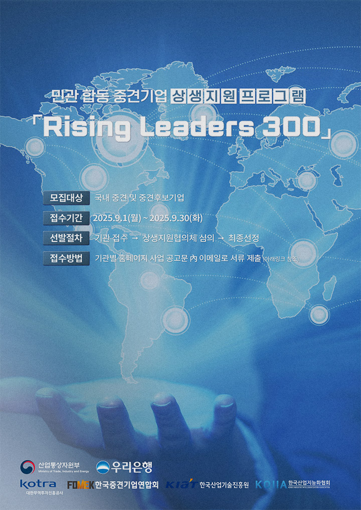 우리은행과 산업통상자원부가 중견기업 위한 금융지원 프로그램인 「Rising Leaders 300」 6기를 모집한다. 「Rising Leaders 300」은 우리은행과 산업통상자원부 및 산하기관이 2023년부터 2027년까지 5년간 우량·선도 중견기업을 발굴해 여신한도 4조원, 금융비용 600억 원을 지원하는 중장기 사업이다. 우리은행은 지난 1기부터 5기까지 총 171개사에 1조 6천억 원의 우대 금융을 지원한 바 있다. 「Rising Leaders 300」 6기 모집 신청은 9월 1일부터 9월 30일까지 진행되며, 산업통상자원부 산하 4개 기관※ 홈페이지에서 접수할 수 있다. 「Rising Leaders 300」 6기는 각 기관의 추천 및 우리은행의 심사를 거쳐 11월 중 최종 선정될 예정이다.