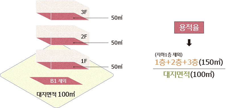 대지면적 가운데 연면적(각 층의 면적을 더한 면적)을 말한다. 땅 크기에 비해 건물을 전체 몇 평까지 지을 수 있는지를 보여주는 수치로, 층수를 올리면 연면적이 커져 용적률이 올라간다. 용적률을 산정할 때는 지하층의 면적, 지상층의 주차용으로 쓰는 면적, 주민공동시설의 면적, 피난안전구역의 면적은 제외한다.