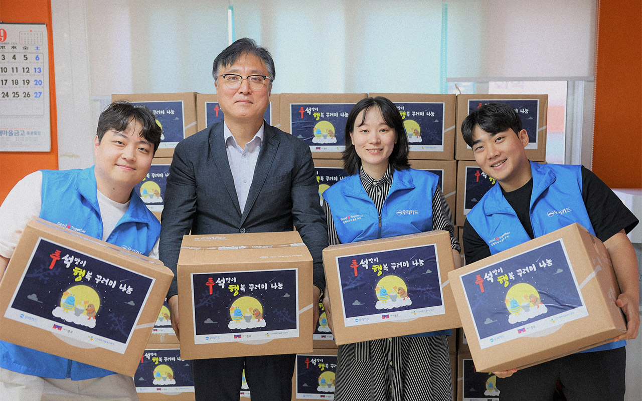 우리카드는 추석을 앞두고 종로구 창신2동에 거주하는 취약계층 100가구에 행복 꾸러미를 전달했다고 지난 9월 29일 밝혔다. 이 꾸러미에는 해물국수, 쌀약과, 당면, 현미, 광천김, 부침가루 등 명절 상차림과 일상 식탁에 필요한 식료품 10가지를 담아 따뜻한 추석을 보낼 수 있도록 배려했다. ESG경영의 일환으로 기획된 이 기부는 2018년도 창신2동과 ‘1사1동 결연’을 맺은 이후 매년 약 4회 나눔을 이어오고 있다. 설날, 가정의 달, 추석, 겨울맞이 행사 등 시기별로 꾸준히 나눔을 실천하며 지역 사회와의 따뜻한 유대감을 쌓아왔다. 지난 5월 가정의 달 기부에 이어, 이번 추석에는 명절 관련 먹거리를 준비해 어르신들께 전달했다.