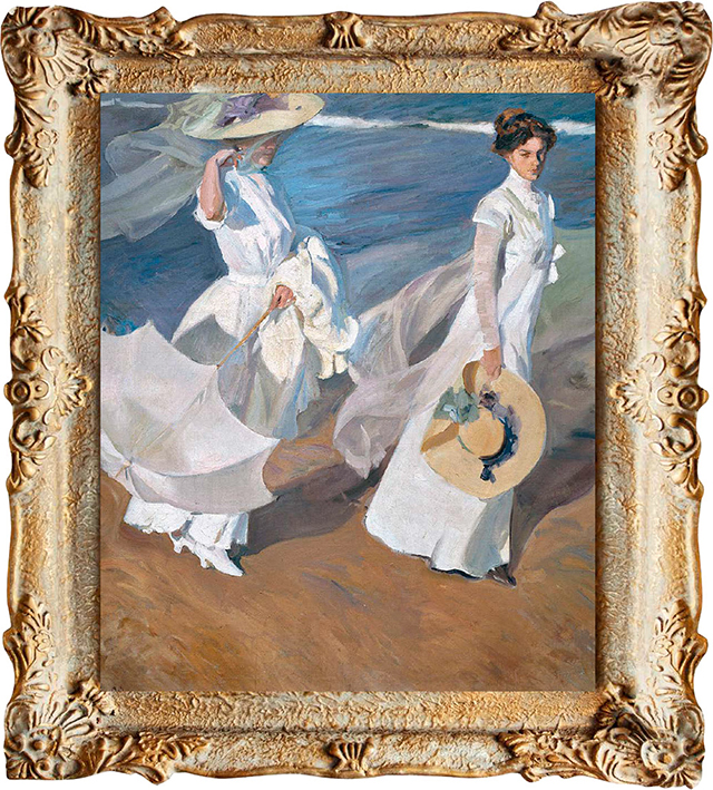 여름의 지중해. 바다는 투명하고 모래는 따뜻하다. 소로야는 가족과 함께 해변을 산책했다. 하얀 드레스를 입은 아내와 큰딸 마리아가 양산을 들고 석양 무렵의 모래사장을 걸었다. 바닷바람이 그들의 옷자락을 휘날리고, 베일이 얼굴을 스친다. 소로야는 이 순간을 놓치지 않았다. 캔버스에 펼쳐진 것은 ‘움직임’의 향연이다.