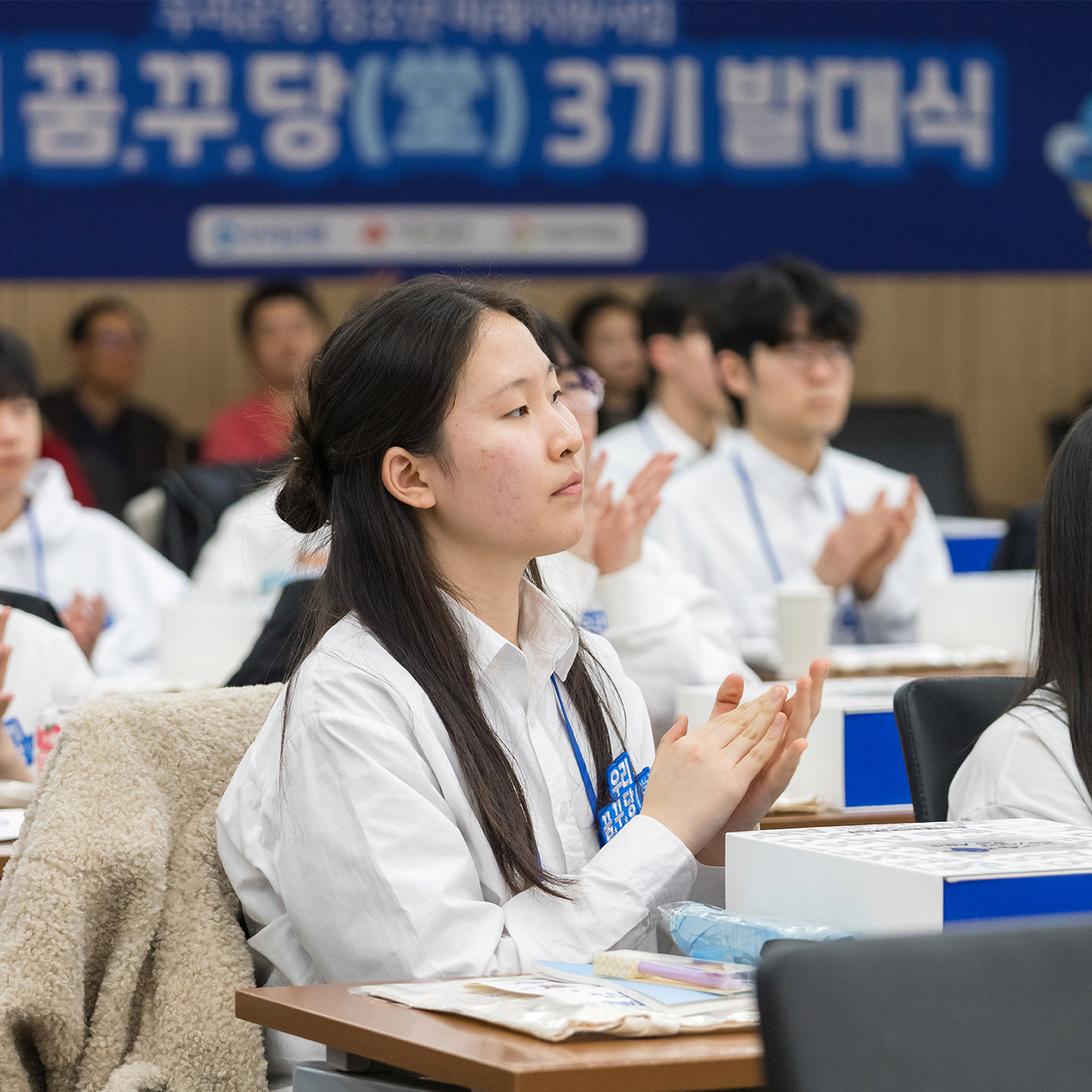이어서 장학증서 수여식이 진행됐다. 정진완 은행장은 장학생 한 명 한 명과 눈을 맞추며 장학증서를 전달했다. 증서를 받은 장학생들의 얼굴에는 설렘과 당찬 포부가 묻어났으며, 현장은 이들의 격려하는 박수 소리로 가득 찼다. 이어지는 기념 촬영에서 모두가 한목소리로 “우리 꿈·꾸·당(堂) 3기 파이팅!”을 외치며 힘찬 첫걸음을 선포했다.
