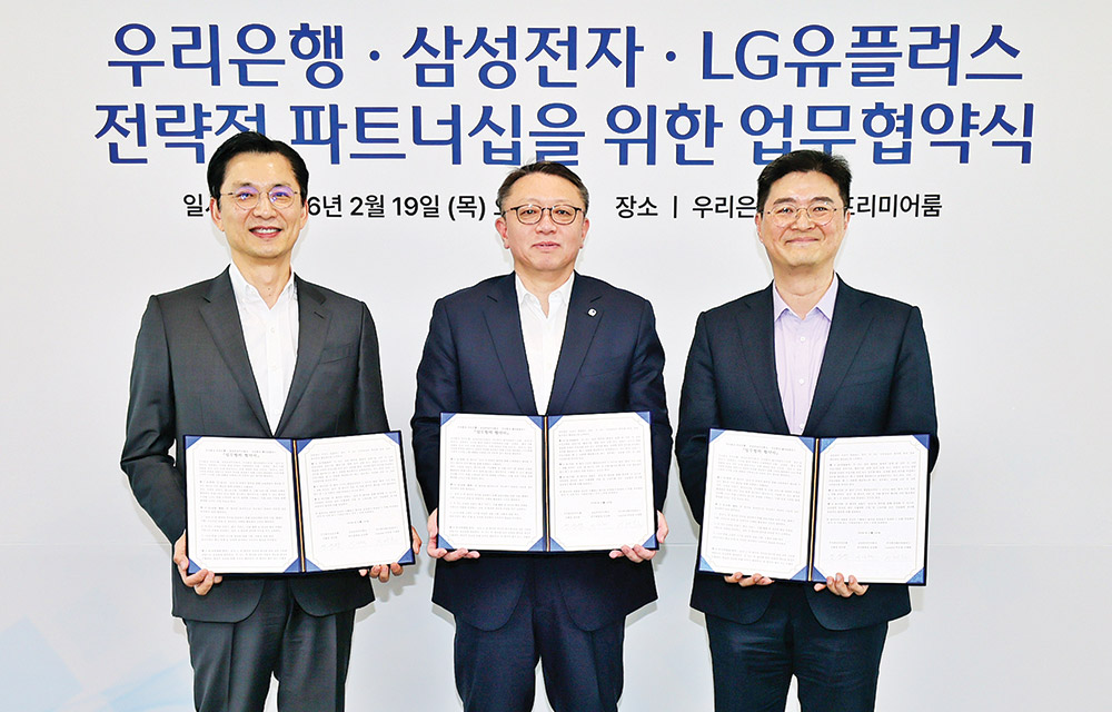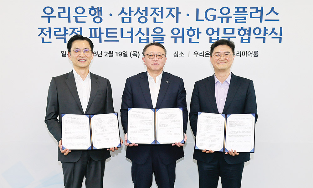 우리은행은 지난 2월 19일 삼성전자, LG유플러스와 함께 1020 미래세대 고객 유치를 위한 공동 마케팅 업무협약을 체결했다고 밝혔다. 이번 업무협약은 금융·모바일·통신 분야를 대표하는 3사가 협력해 모바일 환경에 익숙한 1020 세대의 라이프스타일에 맞춘 금융 서비스를 제공하고, 디지털 기반 고객 접점을 확대하기 위해 마련됐다. 협약식은 지난 19일 우리은행 본점에서 열렸으며, 정진완 우리은행장을 비롯해 임성택 삼성전자 한국총괄 부사장, 이재원 LG유플러스 부사장 등 3사 주요 관계자들이 참석했다. 이번 제휴를 통해 3사는 △1020 미래세대 타깃 공동 마케팅 및 프로모션 추진 △‘삼성월렛머니’ 서비스 홍보 △우리은행 고객에게 휴대폰 특판 등 다양한 협업을 이어갈 계획이다. 특히 모바일과 간편결제에 익숙한 1020 세대를 중심으로 실질적인 혜택을 제공하는 데 초점을 맞췄다.