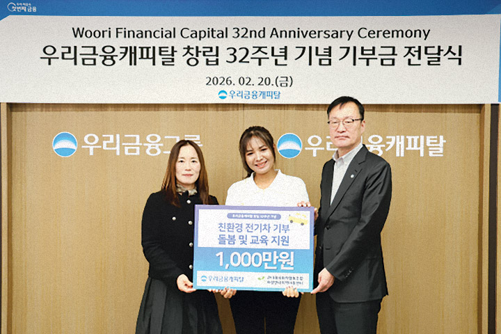 우리금융캐피탈은 창립 32주년을 맞아 지난 20일 서울 강남구 소재 우리금융캐피탈 본사에서 다문화가정 지역아동센터에 기부금 1,000만 원과 친환경 전기차 전달식을 가졌다. 이번 전달식에는 주현중 우리금융캐피탈 전무와 김은주 하성만나지역아동센터 시설장, 우리금융캐피탈 프로당구 스포츠단 ‘우리WON위비스’ 소속 스롱 피아비 선수가 참석했다. 기부금은 임직원이 자발적으로 참여한 급여 끝전 모금과 회사 매칭 기부를 통해 마련됐다. 아울러 다문화가정 아동들의 이동과 체험활동을 지원하기 위한 친환경 전기차도 함께 지원했다. 이번 기부는 다문화가정에 대한 포용금융 실천과 환경을 고려한 ESG 경영 의지를 담았다.
