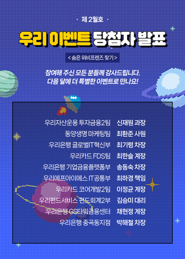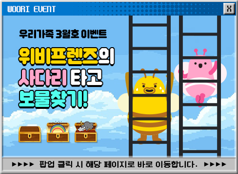 보물 상자를 발견할 것 같은 위비프렌즈를 클릭한다. 실패 시 위비프렌즈와 보물은 랜덤으로 설정됩니다. 포기하지 말고 도전해 보세요! 보물 상자를 발견하면 당첨! 상품 발송에 필요한 정보를 입력한다. 당첨을 기다리면 끝!
