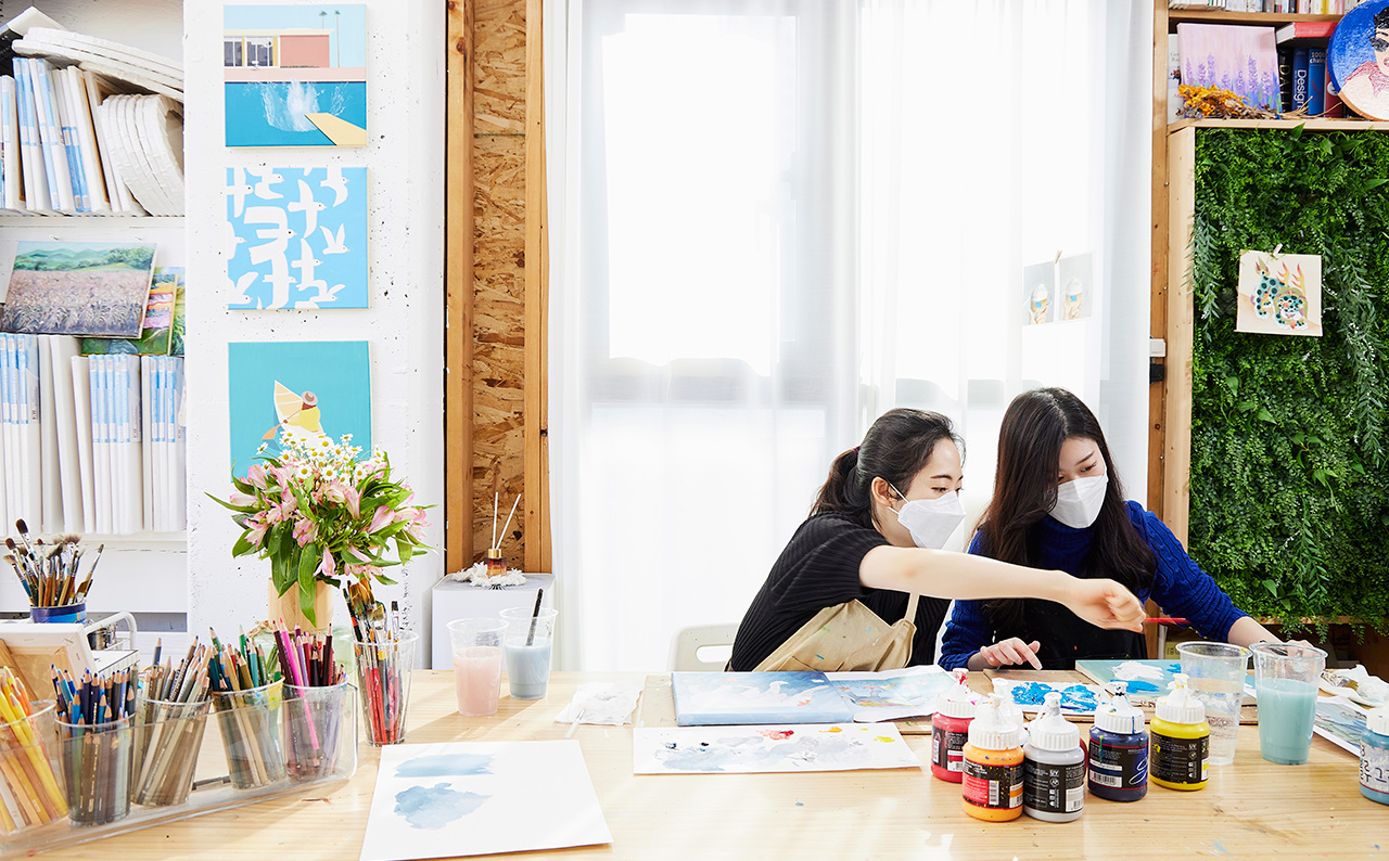 구구절절 말하지 않아도 마음속에 안테나를 켠 듯 텔레파시가 찌릿찌릿 통한다. 취향이나 관심사는 물론 하고 싶은 일도 교집합이 참 많다는 장예진 계장과 박지원 계장. 2021년을 시작하면서 두 사람은 ‘그림’이라는 또 하나의 공통점을 발견했다. 그렇게 어느 주말, 두 사람이 함께 아크릴화 원데이클래스에 나섰다.