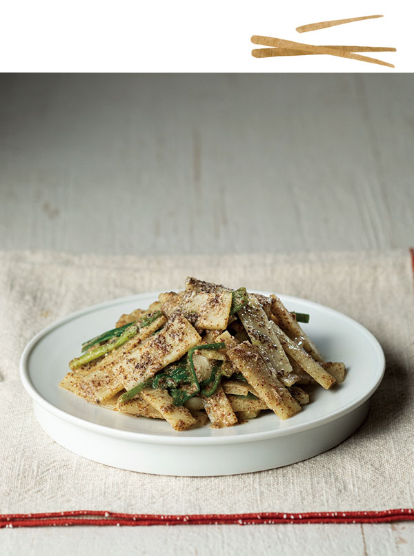 우엉 100g, 쪽파 40g, 들깻가루 2큰술, 식초 약간, 설탕 약간