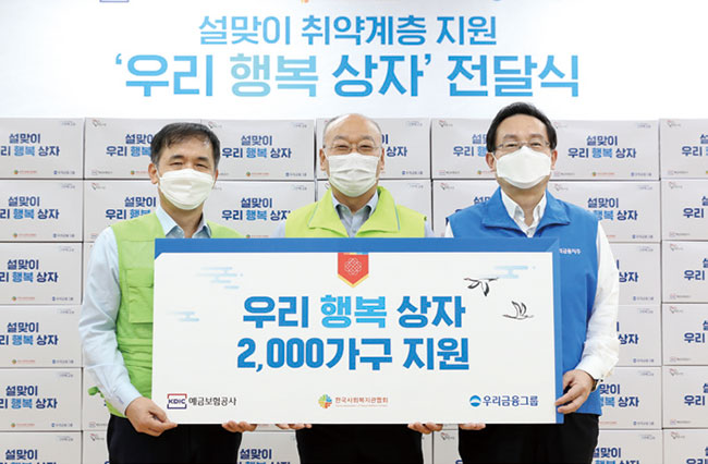 우리금융그룹은 지난 2월 2일 예금보험공사, 한국사회복지관협회와 함께 서울시 중구 중림동 소재 중림종합사회복지관을 방문해 ‘우리행복상자’ 전달식을 가졌다. 우리행복상자는 지역사회취약계층이 따뜻한 설 명절을 보낼 수 있도록 11가지 식료품 및 간편식으로 구성됐다. 이번 우리행복상자는 사회적 기업 및 (사)한국농공상융합형 중소기업연합회에서 추천한 중소기업에서 생산된 물품으로 준비돼 지역사회 취약계층 지원뿐만 아니라 영세기업의 코로나19 극복에도 힘을 보탰다. 우리은행 영업본부 및 예금보험공사 소속 임직원들은 2,000개의 ‘우리행복상자’를 마련했으며, 한국사회복지관협회 산하의 전국 종합사회복지관을 통해 취약계층에 전달됐다.