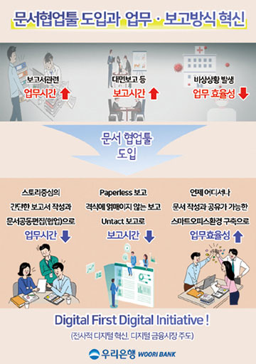 우리은행은 효율적인 문서작성 및 신속한 보고방식의 혁신을 위한 ‘문서협업툴*’을 4월부터 도입한다는 계획이다. 기존 문서작성시에는 내용입력과 구성 등에 많은 시간이 소요됐으나, 웹문서를 이용한 ‘문서협업툴’ 도입에 따라 스토리 중심 문서작성으로 작업시간이 획기적으로 단축되어 업무효율성과 생산성을 높일 수 있다. 또한, 부서·개인별로 문서를 보관하는 방식에서 벗어나 클라우드에 문서를 저장해 공동작업 및 편집이 가능하며, 필요한 문서를 빠르게 검색해 활용하는 등 본격적인 협업 업무가 가능하게 된다. 각종 회의 시에도 문서협업툴 시스템에 접속해 노트북 또는 태블릿PC을 활용한 페이퍼리스(Paperless) 회의시스템을 구축해 환경 보호에 기여할 수 있다. 이와 더불어 개인 휴대폰 및 태블릿PC를 이용해 문서작성 및 편집을 할 수 있는 스마트오피스 환경 구축으로 재택근무 등 비상상황 발생 시에도 업무 연속성이 유지되도록 시스템을 마련할 계획이다. *문서협업툴 : 간편한 문서작성, 편리한 문서 공동작업 및 공유기능이 탑재된 ‘문서협업’ 중심의 협업툴