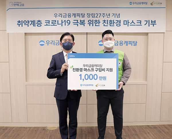 우리금융캐피탈은 장기화된 코로나19로 도움의 손길이 필요한 취약계층을 위한 친환경 마스크 구입비로 1천만 원을 사단법인 희망조약돌에 전달했다고 지난 2월 22일 밝혔다. 우리금융캐피탈은 매년 창립기념일을 소외된 이웃에게 따뜻한 나눔을 실천하는 날로 정하고 사회공헌활동을 펼쳤다. 올해는 우리금융그룹 편입 후 첫 창립기념일을 맞아 ESG 관점과 연계한 사회공헌활동을 전개해 눈길을 끈다. 친환경 생분해 소재의 마스크 1만 1천 장을 취약계층에 전달하고 임직원들에게서 도서 및 헌옷을 기증받아 자원순환을 통해 소외된 이웃을 돕고 환경을 지키는 방안을 마련했다.