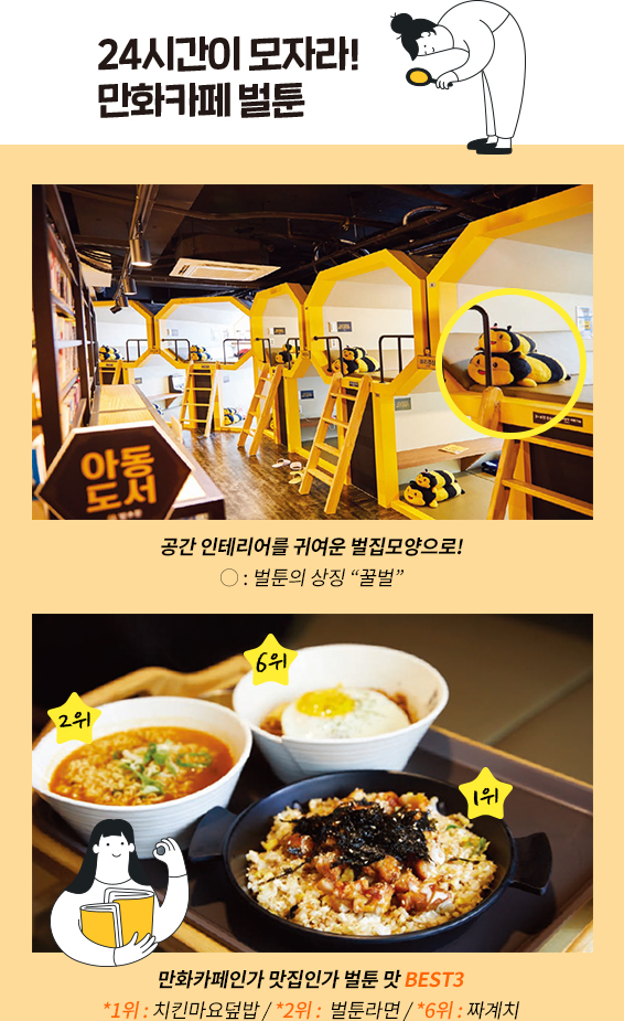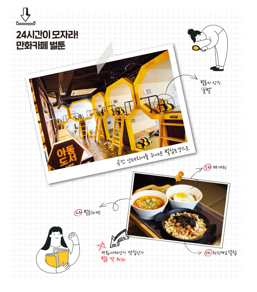 ‘심심한데 갈 데 없을까’라고 생각한다면 만화카페 벌툰으로 여행 가자. 벌툰은 일반 만화방이 아닌 복합문화공간으로, 들어서는 순간 재밌는 놀이가 펼쳐진다. 수만 권의 만화책을 볼 수 있을 뿐만 아니라 보드게임, 오락기, 프라이빗한 넷플릭스 영화방 등 다양한 놀이 콘텐츠를 끊임없이 개발해 MZ세대의 취향을 저격 중이다. 이러한 놀이 콘텐츠를 1시간에 3천 원이라는 저렴한 가격에 즐길 수 있다는 것도 장점. 특히 지난해 시작한 넷플릭스 영화방은 커플 사이에서 큰 인기를 끌고 있다. 전국 70여 곳에서 운영 중이며, 그 중 제주 본점이 국내 최대 면적을 자랑한다. 만약 한두 시간만 머무를 생각이라면 다른 날 방문하는 게 좋겠다. 만화책을 읽다가 다양한 놀이를 즐기다 보면 어느새 반나절이 지나있을지 모르니까.