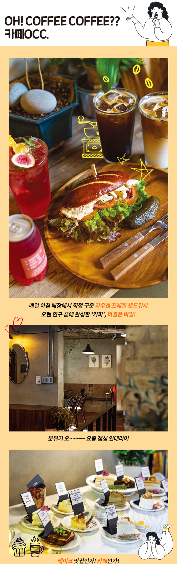 요즘 예쁜 카페를 찾아다니는 여행이 대세다. 카페Occ.로 말할 것 같으면, 삼남매가 함께 식사와 디저트, 음료를 담당하며 운영 중인데, 2019년 겨울에 오픈했다. 장장 9개월 동안 공사를 진행할 만큼 인테리어에 공을 들였다. 초록 식물과 원목 테이블, 꽃과 식물이 그려진 작품의 조합에 어찌 카메라를 꺼내지 않을 수 있으랴. 카페Occ.는 1, 2층으로 나뉘어져 있고 야외 테라스에도 테이블이 마련되어 있어 취향에 따라 좌석을 고를 수 있다. 무엇보다 최고급 커피와 홈메이드 음료, 수많은 케이크와 샌드위치를 맛볼 수 있는 천국 같은 곳이다. 강남을 들르게 된다면, 아니 일부러라도 가보길. 하루 여행지로는 good! 아! 카페에 간다면 별 뜻 없이 지어 카페명에 의미를 만들고 싶은 사장님을 위해 Occ.의 의미도 제안해주길.