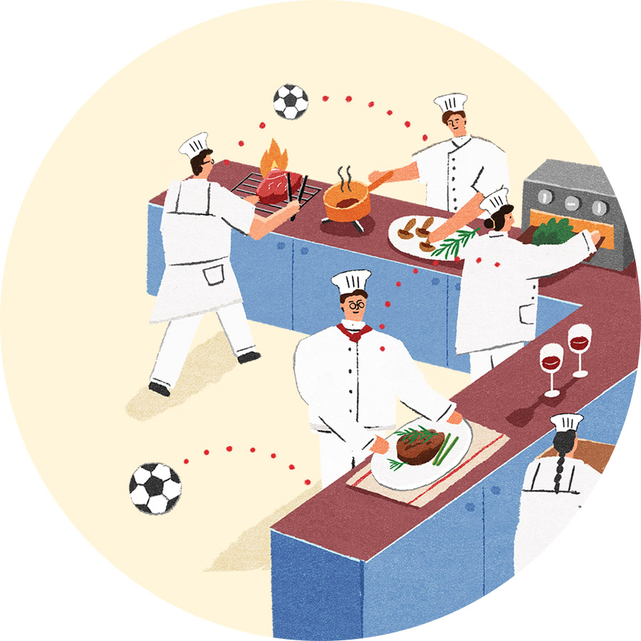 요리사는 이런 재미로 산다. 거의 그렇다. 매상이 좋아서 기쁠 때도 있지만 팀워크가 척척 맞아떨어지는 조직이 더 신나게 만든다. 연봉이 적어도, 팀워크가 끝내줘서 우승하는 축구팀에서 뛰는 게 축구선수의 꿈일지도 모른다. 아니라고? 돈이라고? 메시에게 물어보자. 좋은 패스 100개가 좋은지, 최고 연봉이 좋은지. 어쩌면 “연봉이요! 패스가 오지 않아도 하프라인부터 단독 드리블로 넣으면 되거든요”라고 할지도 모르지만.