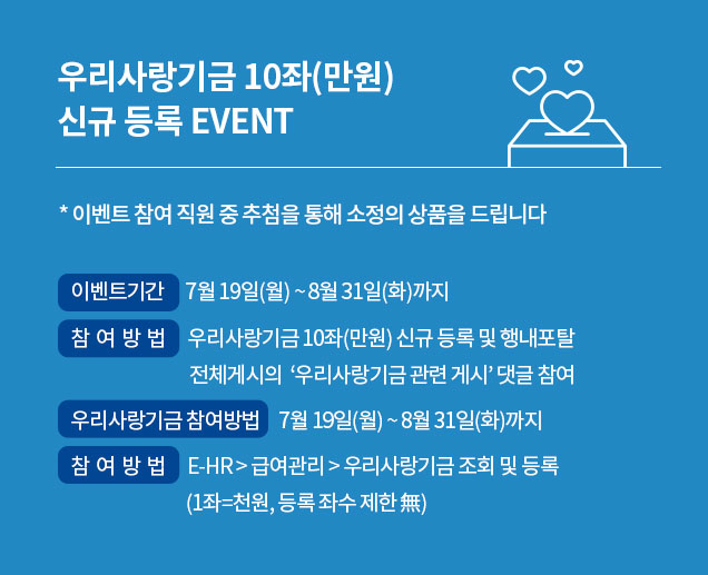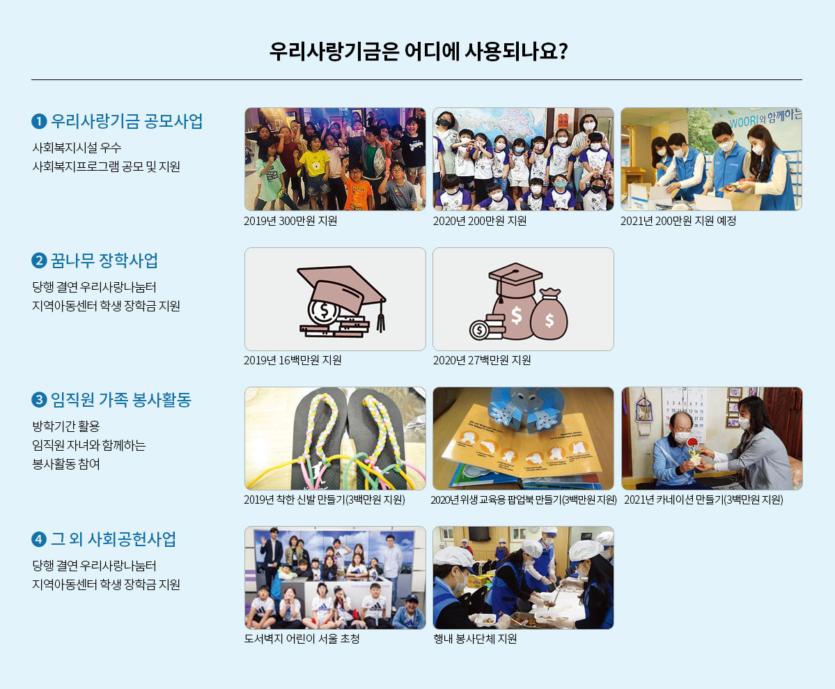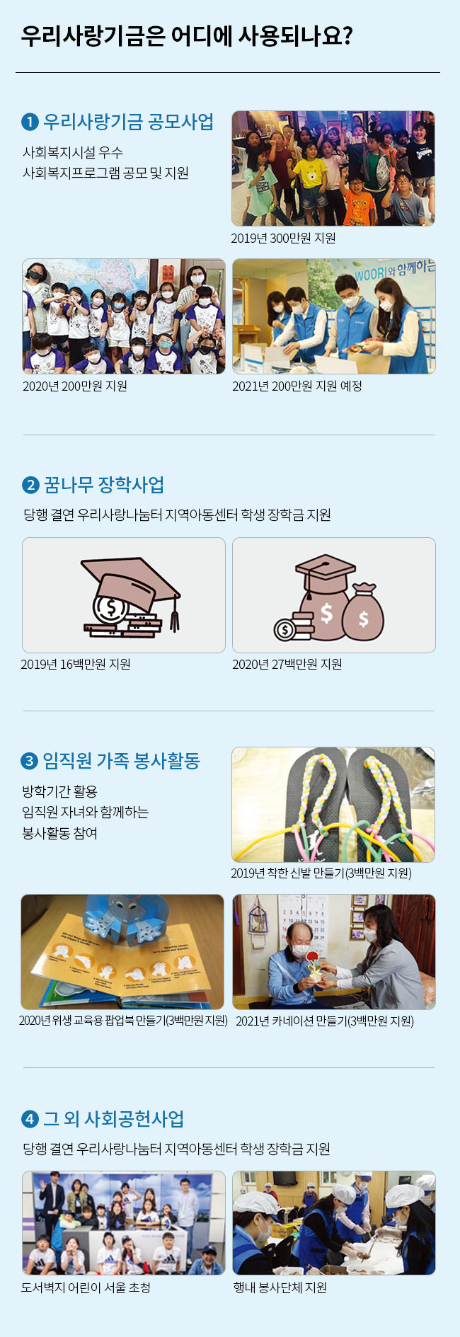 그중 임직원이 직접 기부에 참여하는 우리사랑기금에 대해 알아볼까요?