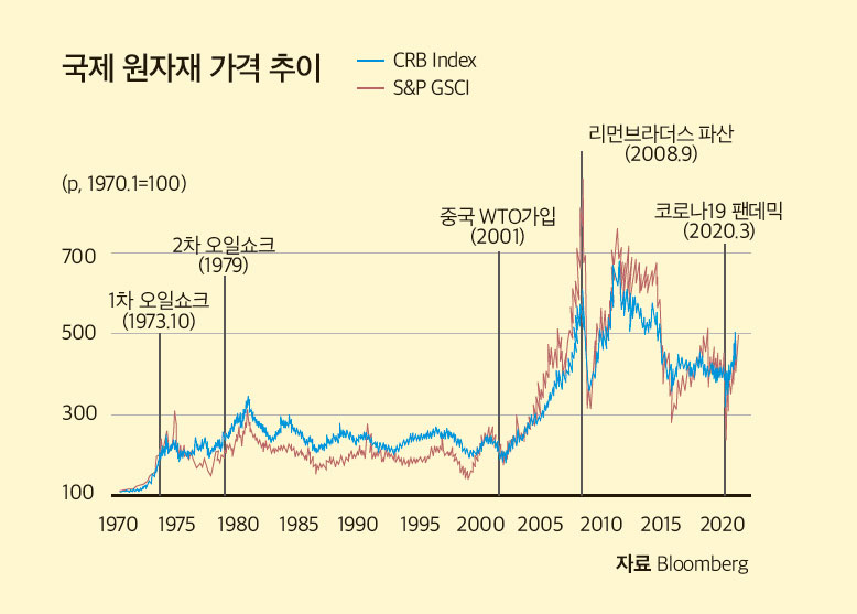 2021년 원자재 가격이 심상치 않다. 금속 원자재들은 건설, 기계장비, 인프라, 운송 등의 산업의 쌀이라 할 수 있다. 특히, 구리는 ‘구리 박사(닥터 코퍼: Doctor Copper)’라고 불릴 만큼, 경기가 하락할지 둔화할지 보여주는 척도(선행지표) 역할을 한다. 구리는 8년 만에 최고치를 기록했다. 그 밖의 알루미늄, 팔라듐, 니켈, 아연, 코발트 등의 산업용 금속 가격이 뚜렷한 상승세를 보이고 있다. 에너지 및 농산물 가격도 마찬가지다. 국제유가가 코로나19 이후 가장 높은 수준을 기록했다. 곡물 가격도 2014년 이후 최고 수준까지 상승했다.
