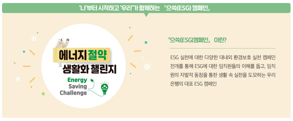 ESG기획부에서는 환경을 살리고, 지구를 지키는 다양한 실천을 위한 『으쓱(ESG)캠페인』을 연중 수행하고 있으며, 우리은행 본점 직원식당에서는 주1회 ‘친환경 건강 식단’을 운영할 계획입니다. 지구를 지키는 우리 가족의 작은 노력이 아름다운 지구를 만듭니다. 많은 참여와 관심 부탁드립니다.