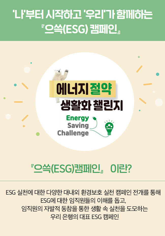 이러한 국가적인 노력에도 불구하고 매년 우리나라의 에너지 사용량은 꾸준히 증가해왔고, 해마다 여름철 전력수급 위기는 반복되고 있습니다. 우리은행에서도 지난 8월부터 ‘으쓱(ESG) 캠페인’의 일환으로 사무실 에너지 절약 실천을 위한 ‘에너지 절약 생활화 캠페인’을 진행하고 있는데요.