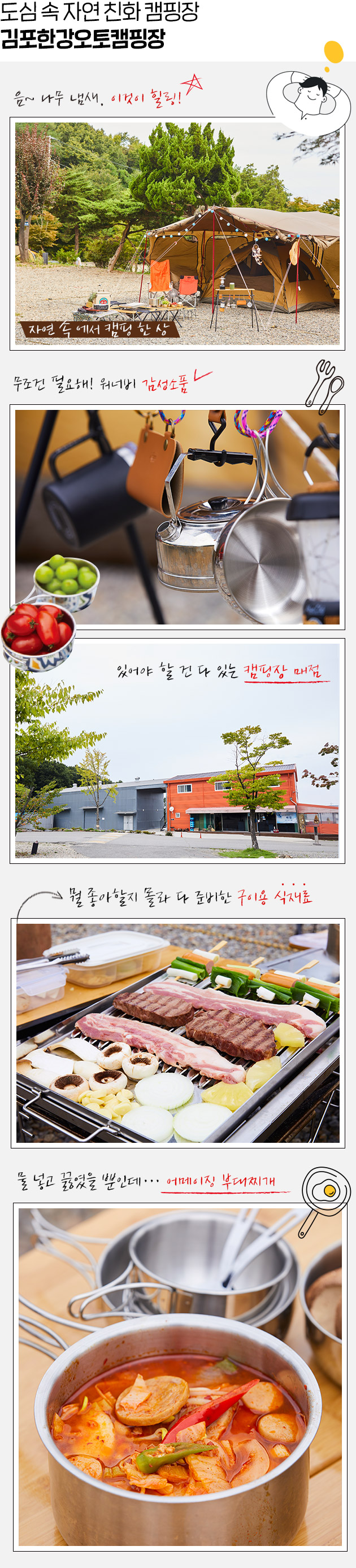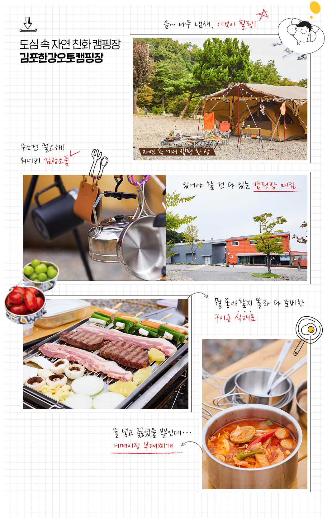 김포한강오토캠핑장은 특별한 시설보다 진정으로 캠핑을 좋아하는 사람들을 위해 꼭 필요한 것만 갖춘 곳이다. 산과 나무, 자갈과 풀꽃 같은 자연의 아름다움을 만끽할 수 있으면 그것만으로 충분하지 않은가. 캠핑장이 있는 하성면 일원은 애기봉과 전류리 포구, 후평리 철새도래지, 태산 패밀리파크와 같은 김포의 대표 여행지들이 많으니 김포 여행의 베이스캠프로 김포한강오토캠핑장을 찾는 것도 좋겠다.