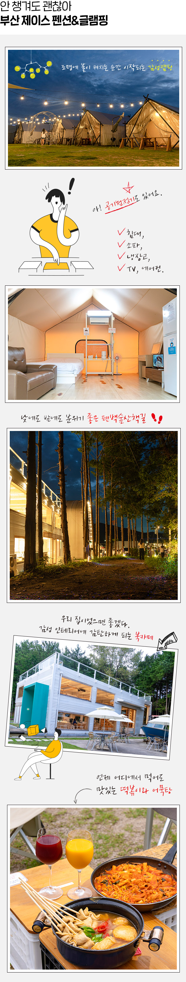제이스 펜션&글램핑에서 하룻밤 묵는다면 각종 캠핑장비를 챙겨야 하는 수고로움이 없어도 된다. 텐트는 물론 침대, 냉장고, 에어컨, 주방도구 등 숙박에 필요한 모든 옵션을 갖추고 있다. 심지어 간장, 식용유, 고춧가루 등의 각종 양념까지도.