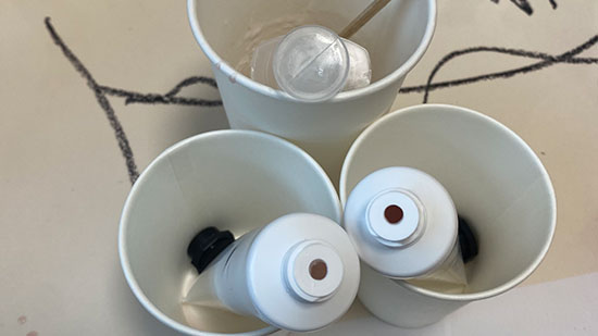 ② 작은 종이컵에 칼라민분말, 달맞이꽃종자유, 글리세린을 넣고 나무막대로 섞어준다. 그 후 녹여둔 비누액의 반을 부어서 나무막대로 잘 섞어준다.