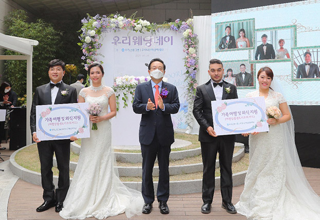 우리금융그룹 우리다문화장학재단은 지난 10월 30일 서울 중구 소재 우리은행 본점에서 다문화부부를 위한 결혼식 제10회 우리웨딩데이를 개최했다. 올해 우리웨딩데이에는 필리핀, 모로코, 미얀마, 베트남, 러시아, 몽골, 대만, 중국 등 총 8개국의 다문화부부 열 커플이 선정됐다. 코로나19 감염병 예방을 위해 여덟 커플은 손태승 이사장의 영상 주례사와 실시간 온라인 중계로 결혼식을 했고, 두 커플은 우리은행 본점에 마련된 자연친화적 정원 ‘숨터’에서 야외 결혼식을 올렸다. 더불어, 두 커플을 위해 특별히 준비된 야외 결혼식은 ‘우리다문화어린이합창단’과 ‘우리다문화오케스트라’의 축가로 기쁨을 함께 했으며, 두 부부가 직접 작성한 혼인 서약서를 낭독하며 우리웨딩데이의 의미를 더했다. 특히, 이번 우리웨딩데이는 열 번째 행사로, 올해 100번째 커플이 탄생해 더 큰 기쁨과 의미가 있었다.