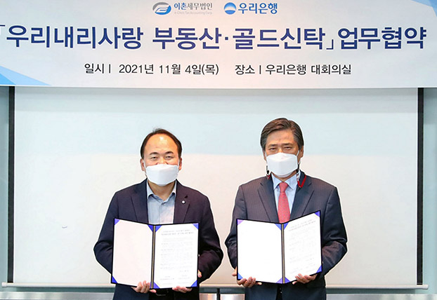 우리은행은 지난 11월 4일 서울 중구 소재 우리은행 본점에서 이촌세무법인과 ‘우리내리사랑 부동산·골드신탁 업무협약’을 체결했다. 이날 협약식에는 심상형 우리은행 투자상품전략단장, 박외희 이촌세무법인 대표이사가 참석했으며, 우리은행의 상속·증여 신탁상품 가입 고객을 위한 세무자문 서비스 제공 및 상품마케팅 추진을 위해 양사가 적극 협력해 나가기로 했다.