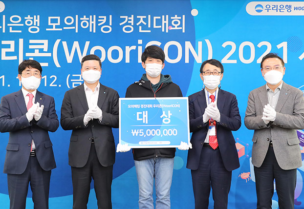 우리은행은 지난 11월 12일 서울 중구 소재 우리은행 본점에서 금융보안원과 공동으로 실시한 금융권 최초 모의해킹 경진대회 ‘우리콘(WooriCON)’ 시상식을 개최했다. 11월 |1일부터 5일까지 대학(원)생 대상으로 진행된 이번 대회는 우리은행이 운영하는 인터넷뱅킹과 우리WON뱅킹 전반에 대해 사이버 공격자 관점에서 취약점을 점검 하는 방식으로 열렸다.