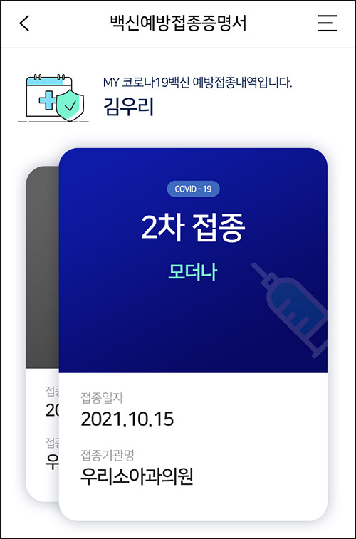 해당 서비스는 ‘정부24’ 백신 접종 증명서를 우리WON카드 앱의 마이데이터 메뉴에서 연동 후 이용 가능하며, 백신 종류 및 접종 차수, 일자, 기관명 등의 정보를 조회 할 수 있다.
