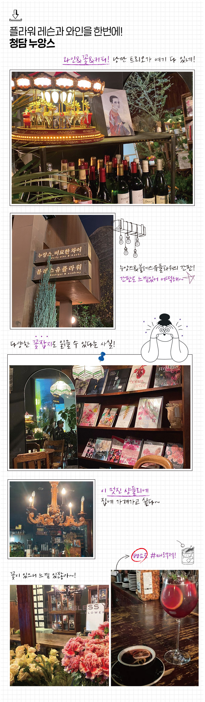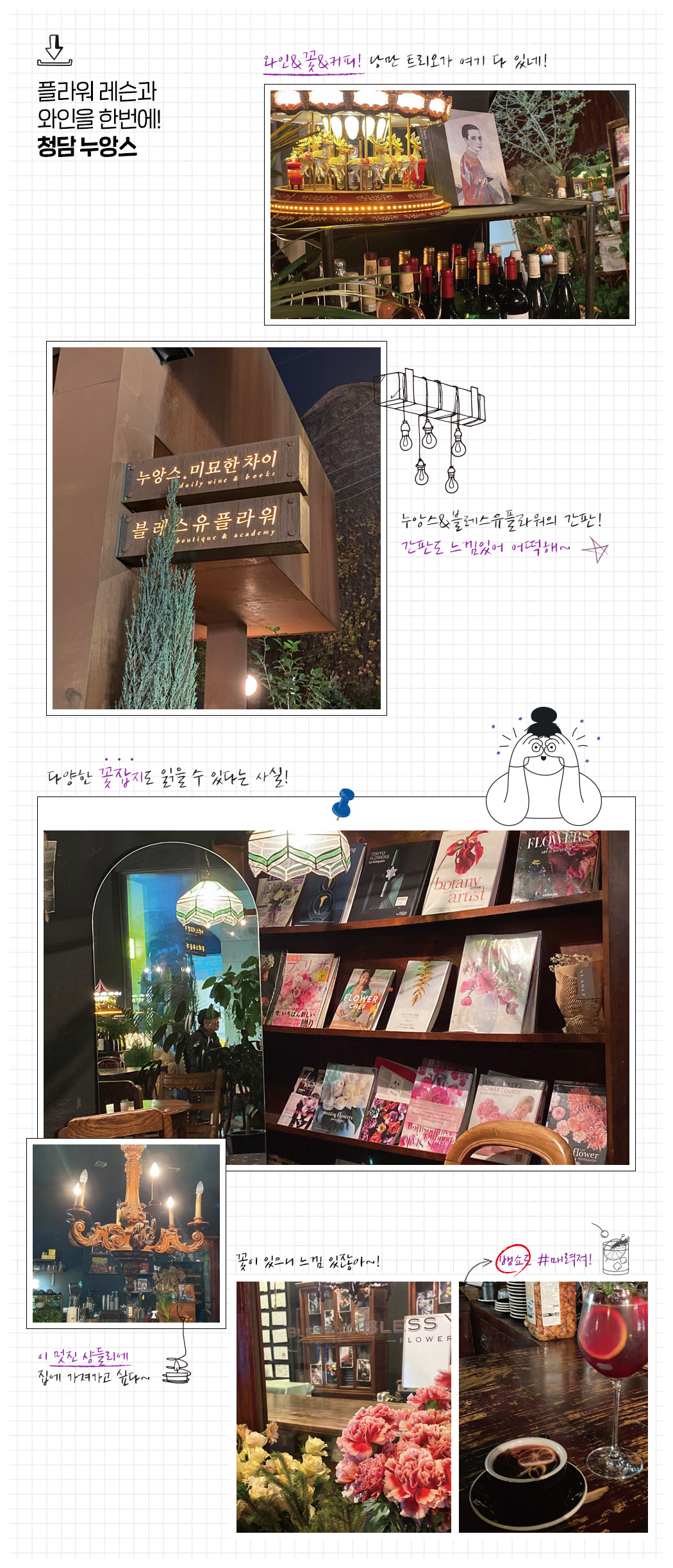 여리여리한 생화들이, 공간에 생기와 감성을 불어넣고 있다. ‘미묘한 차이’라는 뜻인 누앙스의 이름답게, 이질적이고도 이국적인 아이템과 꽃이 모여 예술적인 정서를 자아낸다. 한겨울의 낭만을 체험하고 싶다면, 청담 누앙스에서 꿈같은 시간을 가지시길!