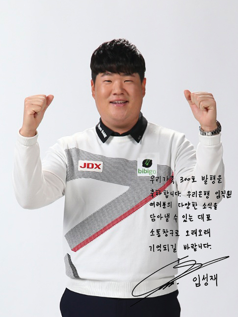 “안녕하세요. 배우 이종혁 입니다. 우리은행 사보 300호, 진심으로 축하드립니다.^^ 2022년 임인년과 함께 300호를 맞이했는데요. 기운이 좋은 것 같습니다. 우리가족 여러분 모두 호랑이 기운 솟는 특별한 한 해 보내시길 바랍니다.”