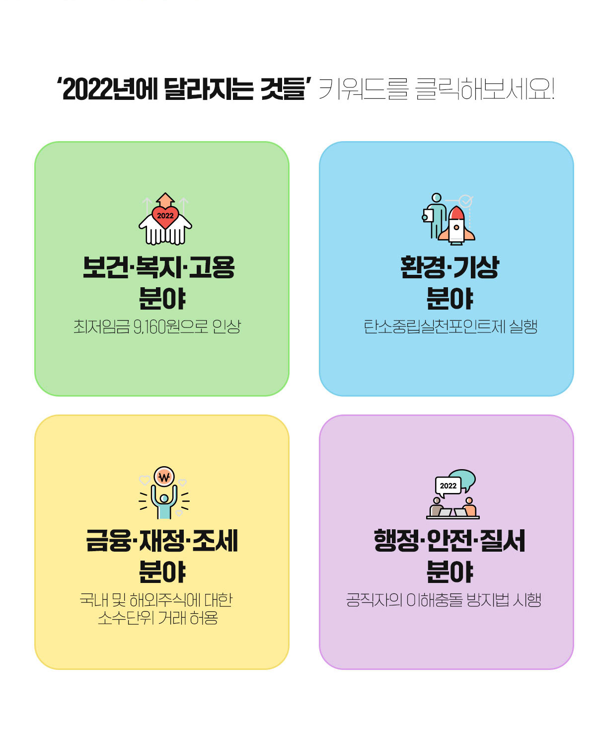 2022년은 제20대 대통령 선거와 제24회 베이징동계올림픽, 제22회 카타르월드컵 등 국내외에서 굵직한 행사가 연이어 이어지는 해다. 거대한 변화의 물결이 예고되는 바, 2022년에 분야별로 새롭게 바뀌는 제도들을 알아보자.