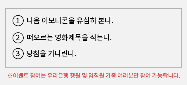 벌써 3월입니다! 3월에도 여러분의 쉬는 시간을 함께할 이벤트 들고왔어요. 바로 이모지퀴즈! 이모티콘이 나타내는 말은 무엇인지 찾는 퀴즈란 거 다들 아시죠~? 이번에는 영화제목입니다. 다음 이모티콘을 보고 연상되는 영화 제목을 정확히 적어주세요!
