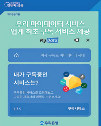 우리은행은 작년 12월 오픈한 ‘우리 마이데이터’ 서비스에서 업계 최초로 고객이 가입한 제휴사의 구독 상품 정보를 한 곳에 모아 간편하게 조회하고 가입할 수 있는 ‘구독 서비스’를 제공한다.