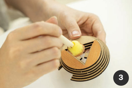 나무 받침의 가운데 홈으로 LED 전구의 전선을 통과시킨 뒤 등에 넣어 조립하여 완성합니다.