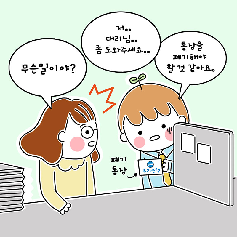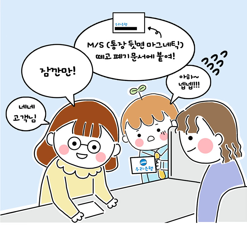 통장 오 사용으로 폐기를 해야 하는 일이 발생했는데요. 당시 폐기를 처음 해보던 저는 당황했습니다. 옆자리 대리님들도 바빠 보였지만, 일단 용기 내서 물어봤어요. “통장 폐기 어떻게 하나요?” 제 목소리를 들었지만, 한창 바빴던 때라 대리님들은 일하면서 대답해 주셨어요.