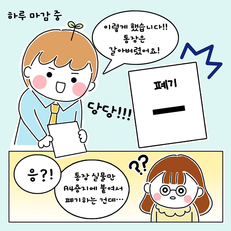 마감이 되어서 알게 되었습니다. 제가 잘못했다는 것을요. A4 정중앙에 마그네틱을 붙이고 자랑스럽게 대리님들을 보여드렸어요. “이렇게 했습니다!” 그걸 본 대리님들의 반응이 아직도 잊히지 않네요. “아... 통장 실물만 A4용지에 붙여서 폐기하란 소리였는데….”