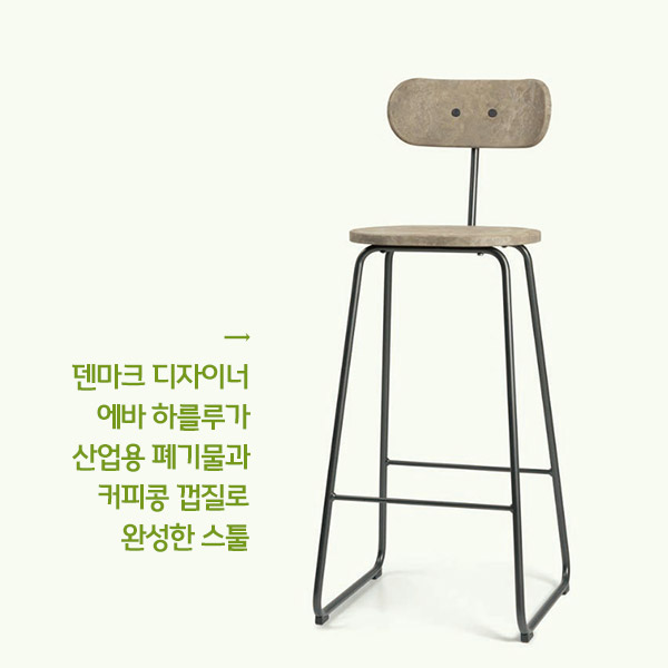 전 세계 가구 브랜드와 디자이너 사이에서도 비건이 대세다. 가구의 주원료인 가죽과 플라스틱 대신 ‘버려진’ 자연재료를 사용하는 제품이 눈길을 끄는 중. 커피 찌꺼기나 과일, 채소, 견과류 껍질 그리고 낙엽이나 풀처럼 버려지는 자원의 쓸모를 되살려내는 케이스가 많다. 원두 껍질과 맥주를 생산하고 남은 부산물을 활용한 스툴, 잔디나 나뭇가지등을 친환경 수지와 혼합해 만든 테이블, 와인 생산 후 남은 과육을 활용한 조명, 바닷가에 버려진 어망의 폐기물을 혼합해 만든 원사를 사용한 가구 등 견고한 내구성과 아름다운 디자인을 두루 갖춘 가구가 주목받고 있다.
