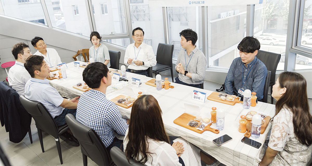 만들어진 요리를 하나 둘, 테이블 위에 놓으니 그럴싸한 한 상이 차려졌다. 야채와 밥을 넣고 김에 싸서 특제 소스인 겨자소스에 콕 찍어 먹고서는 다들 “맛있어요!”라며 한마디씩 하기 바쁘다. 허기진 배를 맛있는 요리로 달래며, 직장생활 이야기와 고민을 나누기도 했다. “어떻게 하면 남편과 싸우지 않고 잘 지낼 수 있을까요?”라며 곧 결혼을 앞둔 민선영 계장이 질문을 하자 손태승 회장은 “일단 이야기를 많이 나눠야 해”라며 조언을 해주었다. 그 말에 결혼을 한 모든 직원들은 공감한다는 듯 고개를 끄덕였다.