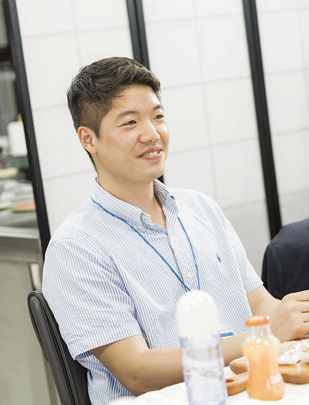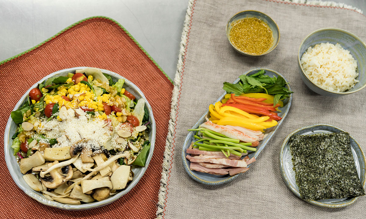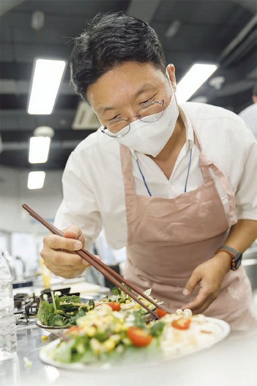 “회장님께서 늘 저희에게 밥 한 끼 먹자고 하셨는데, 만들어진 음식으로 한 끼 하는 줄 알았거든요. 이렇게 직접 만들어서 먹게 되니 또 새롭네요.” 블루팀 박성진 계장의 한마디로 순식간에 테이블 위는 웃음꽃이 피었다. 그간의 안부도 묻고, 인사도 나눌 겸 마련된 대화 시간이 끝나고 드디어 요리에 나설 차례. 지난번 메인 요리가 ‘볶는 요리’였다면, 이번에는 겨자소스 셀프 김밥과 모듬 버섯 샐러드로 ‘써는 요리’다.