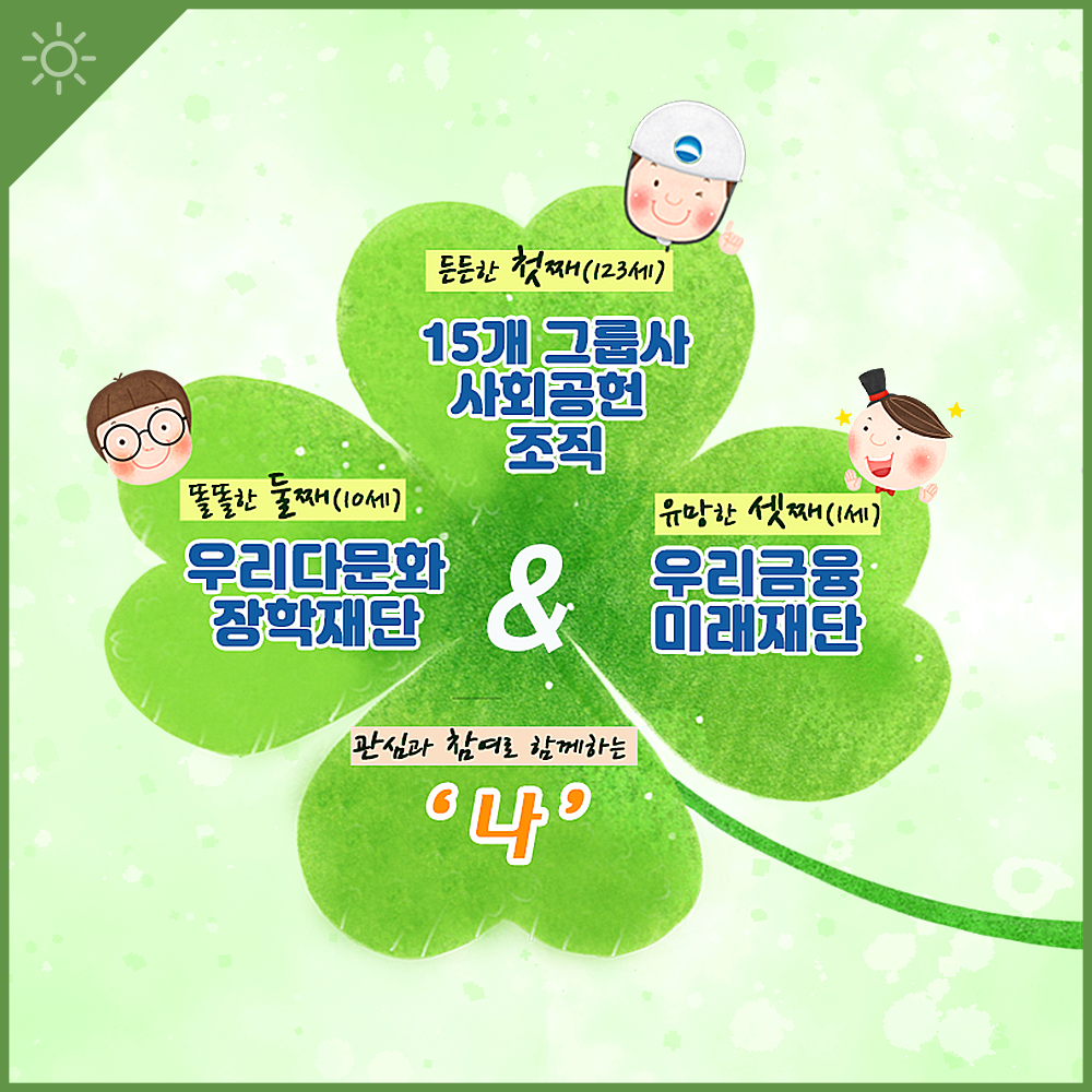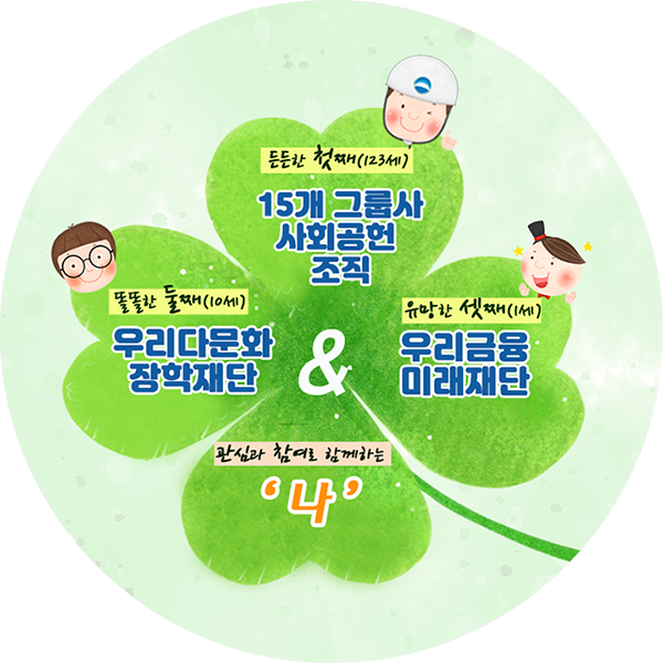 우리금융그룹은 15개 그룹사 사회공헌 조직, 우리다문화장학재단, 우리금융미래재단 따끈한 삼형제를 중심으로 세상에 온정을 전하고 있습니다. 우리금융그룹의 대표 사회공헌 활동을 만나볼까요?
