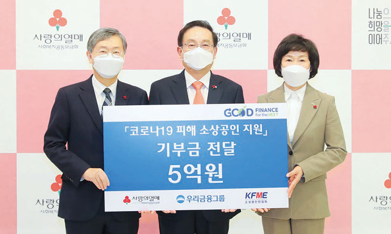 시의성 있는 사회공헌 활동도 전개 중이다. 최근 집중호우로 피해를 본 수재민들의 생계지원과 피해 복구를 위해 주요 그룹사들(우리금융지주, 우리은행, 우리카드, 우리금융캐피탈, 우리종합금융, 우리금융저축은행)이 자발적으로 동참해 총 20억 원을 기부한 것.