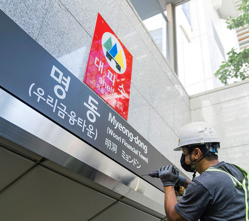 지난 9월 2일, 모두가 기다리던 순간이 눈앞에 펼쳐졌다. 명동역 1번 출구 앞에서 기존의 안내 표지판을 내리고 우리금융타운이 표기된 안내표지로 바꾸는 작업이 진행된 것. 표지판이 교체되는 모습에 지나가는 사람들도 발길을 멈추고 한참을 바라봤다.