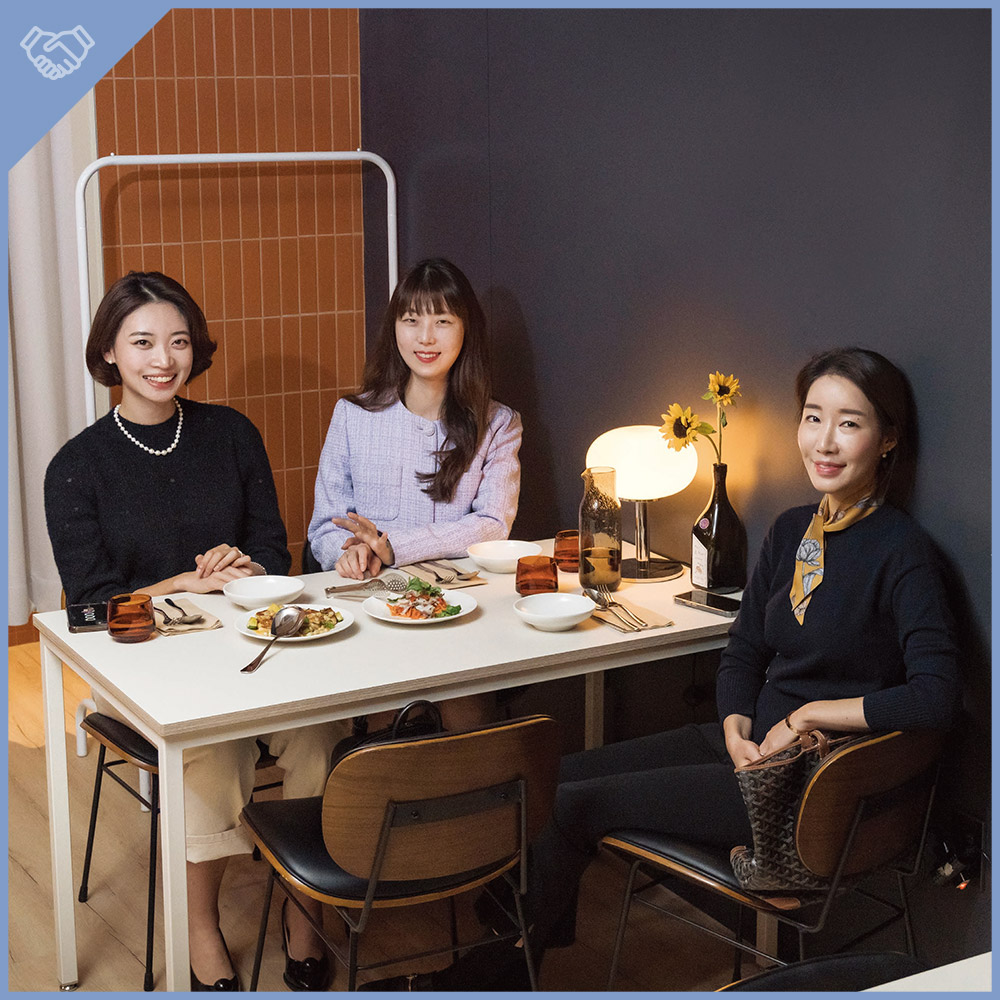 이토록 돈독한 사이인 세 사람이 만나게 된 이유는 바로 김지아 대리의 추진력 때문. “포털 게시를 보자마자 민령이와 혜린이가 떠올랐어요. 보자마자 ‘이건 우리를 위한 먹부림의 자리야!’라며 아이들을 설득했죠.” 말은 이렇게 했지만, 김지아 대리는 조금의 여유만 생겨도 만나고 싶은 친구들이라, 함께 좋은 시간을 보내고 싶었다고 속마음을 전했다.