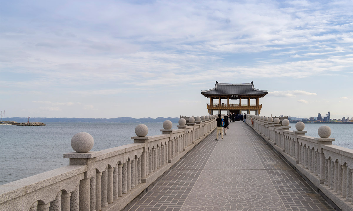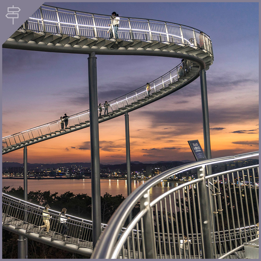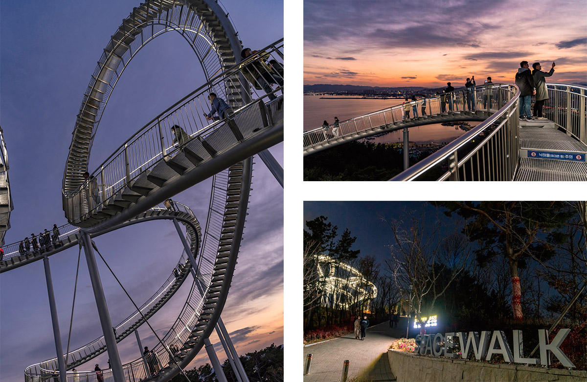 영일대해수욕장 인근에 자리한 환호공원은 지금 가장 사랑받는 ‘핫플’로 거듭났다. 롤러코스터를 방불케 하는 철탑이 우뚝 솟았는데, 공원의 평온한 분위기와 대비를 이루며 짜릿한 입체감을 선사한다. 바로 도보체험 구조물 ‘스페이스 워크’다. 땅에서 위로 올려다보면 그 압도적인 장관에 사로잡힌다. 견고하면서도 유려한 곡선을 자랑하고, 차가우면서도 신비스러운 풍경을 보여준다. 총 길이 333m, 최대 높이 57m의 트랙은 계단으로 이루어져 있는 덕분에 직접 두 발로 걸으며 ‘살아 있는’ 체험을 할 수 있다. 한 계단, 한 계단 오를 때마다 아찔하고 오싹한 느낌이 밀려든다. 마치 우주를 걷듯, 가파른 경사의 계단을 부지런히 오르다 보면 어느새 두 발 아래 땅을 거느리게 된다. 거센 바닷바람이 불어올 때면 철제 구조물이 살짝 휘청이는데, 이마저도 짜릿한 쾌감으로 다가온다. 온갖 두려움과 난관을 극복하고 마침내 정상에 도착하면 영일대 해변과 제철소 풍경을 내려다볼 수 있다.