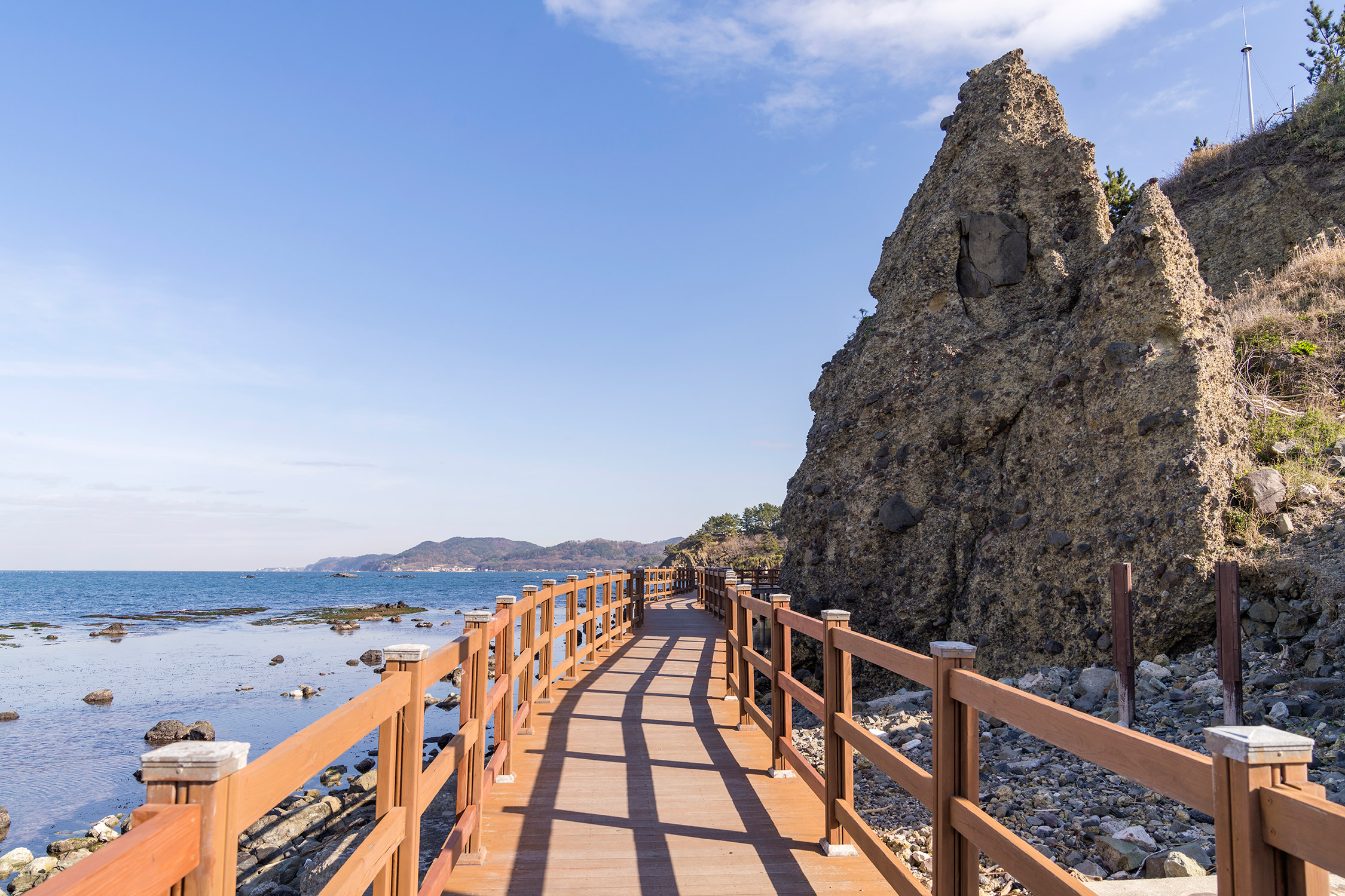 포항 남쪽의 청림 해변에서 상생의 손 호미곶에 이르는 호미반도 해안둘레길에서는 경이로운 자연과 영겁의 시간을 경험할 수 있다. 약 25㎞의 4개 코스로 이루어진 둘레길 중 2코스 선바우길에는 해상 데크길이 이어지는데, 길 왼쪽으로 탁 트인 동해 풍경이 자리하고 오른쪽으로는 해안 절벽과 기암괴석들이 바로 눈앞에 펼쳐진다.