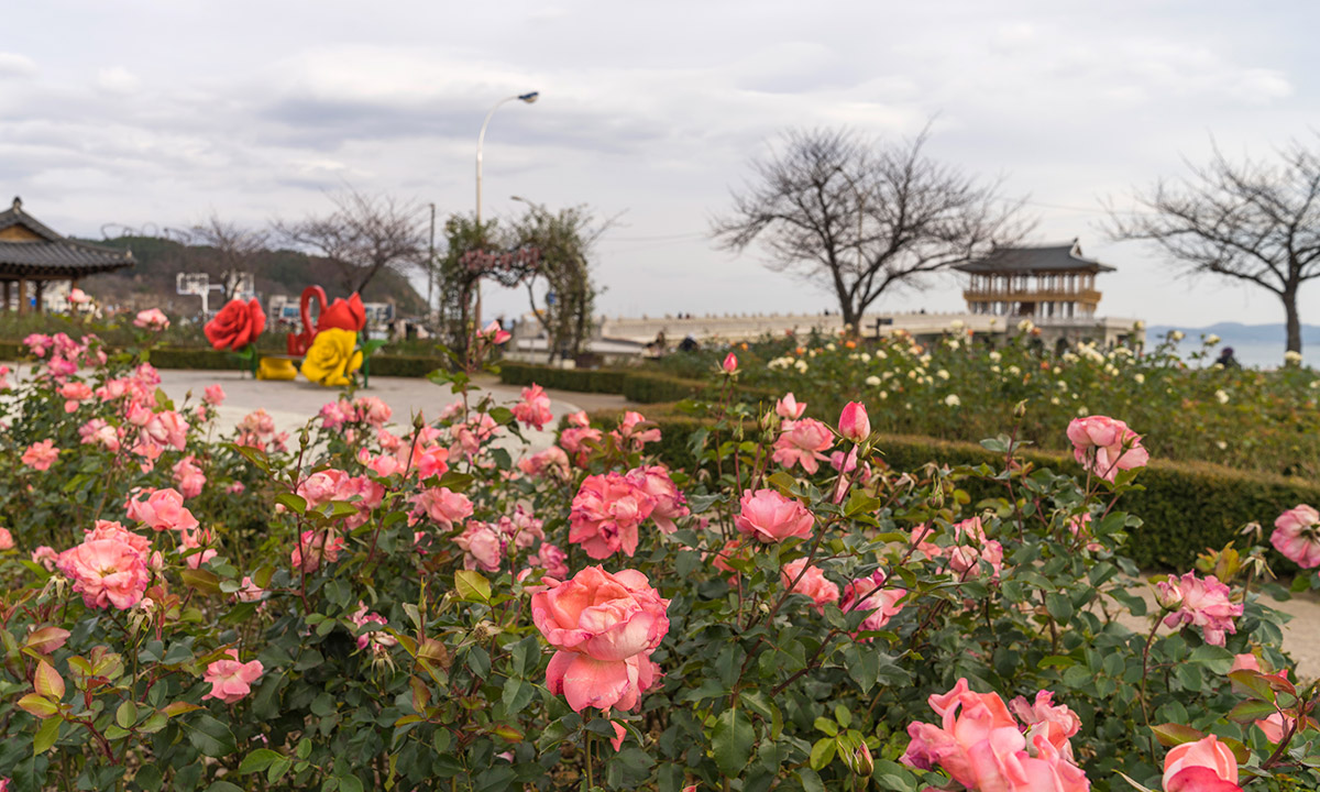 이곳을 대표하는 전통 누각인 영일대는 우리나라 최초 해상 누각으로 바다 한가운데 심은 돌기둥 위에 세워졌다. 석조다리와 기와지붕의 목조 구조물이 장엄한 바다와 어우러져 고풍스러운 분위기를 자아낸다. 해변에서 바다를 향해 놓인 영일교를 건너 영일대 2층에 오르면 푸른 바다가 발아래서 넘실대는 풍경을 감상할 수 있다. 시선을 멀리 보내면 영일만 일대와 제철소 풍경을 한눈에 담을 수 있다. 해수욕장 주변에는 장미를 테마로 한 장미원이 자리하는데, 장미 형상의 조형물이나 설치작품을 배경으로 인증사진을 남기기에도 그만이다. 영일대는 해가 지면 낮과는 또 다른 매력을 뽐낸다. 바다 건너 자리한 제철소에서 LED 조명을 반짝이며 화려하고 신비로운 야경을 선사한다.