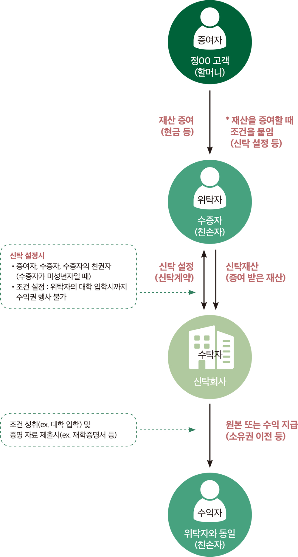 정OO 고객의 고민은 ‘이벤트형 신탁’을 통해 해결할 수 있습니다. ① 정OO 고객은 임야를 판 돈 2,000만원을 친손자에게 신탁 설정을 조건으로 하여 증여합니다. ② 정OO 고객과 친손자(수증자), 친손자의 친권자(아들 내외)와 함께 신탁을 설정합니다. ③ 신탁을 설정할 때 위탁자 겸 수익자를 친손자로 하며 친손자가 수익권을 행사할 수 있는 조건(이벤트 : 대학 입학)을 붙입니다. ④ 이외에 위탁자인 친손자 또는 위탁자의 친권자가 단독으로 신탁을 해지할 수 없도록 조치합니다. ⑤ 향후 친손자는 대학에 입학한 후 수탁자에게 대학의 재학증명서, 입학증명서를 제출하면 온전히 신탁재산을 찾아서 쓸 수 있습니다.