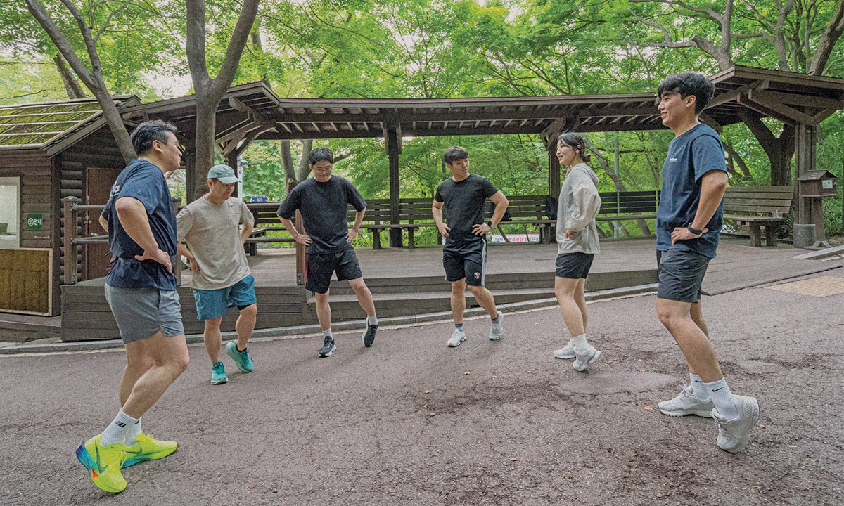 정석 작년 이맘때 시작된 게 벌써 1년이 접어들었네요. 저희는 매주 수요일을 ‘정기 러닝 데이’로 정했습니다. 총 18명이 있는 오픈채팅방에서 매주 월요일에 수요일 정기 러닝 참석 여부를 확인해요. 아직은 인원이 많지 않아서, 역할 분담은 없습니다. 자유로운 시스템이라고 보면 될 것 같아요. 디지털 타워 로비에서 저녁 6시 30분까지 집결해 남산코스로 출발합니다. 도착하면 준비운동을 하면서 몸을 풀어요. 그리고 러닝을 시작하죠. 루틴이 잡히다 보니까, 저녁 8시 전에는 항상 운동을 마치게 되는 것 같아요.