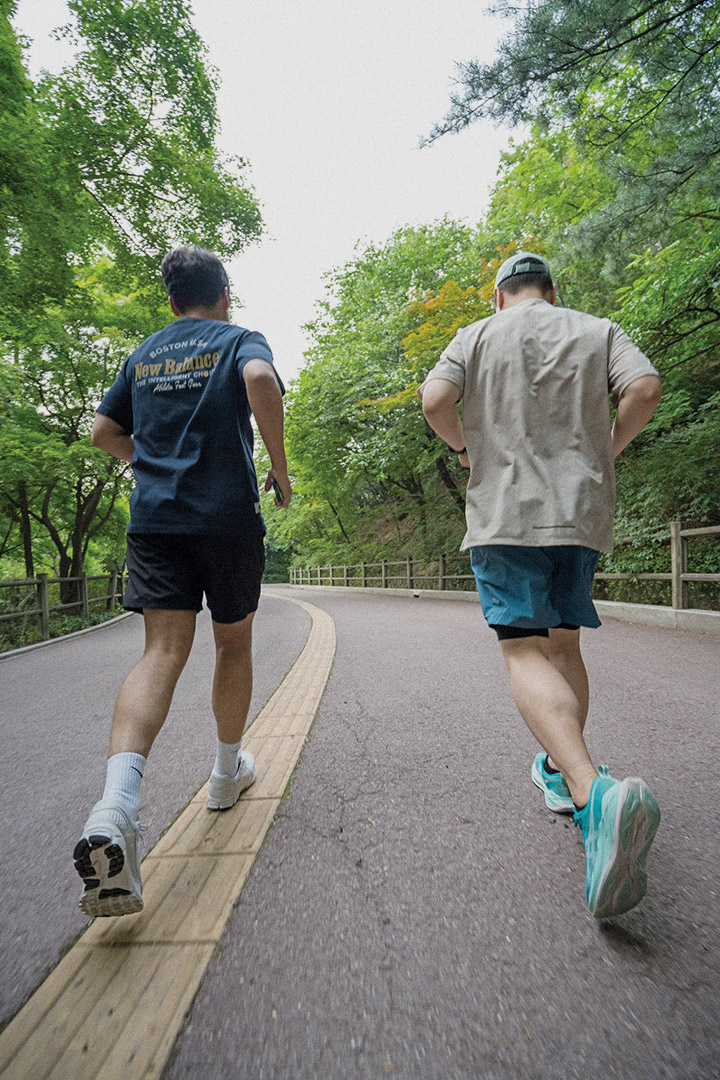 정석 달리기할 때 자유롭다고 느껴요. 그 감정이 좋더라고요. 볼이 빨개진 나, 숨이 턱까지 차오른 나, 그리고 함께 뛸 때 느껴지는 감정이 있어요. 혼자 뛰면 중간에 포기하고 싶을 때가 많거든요.