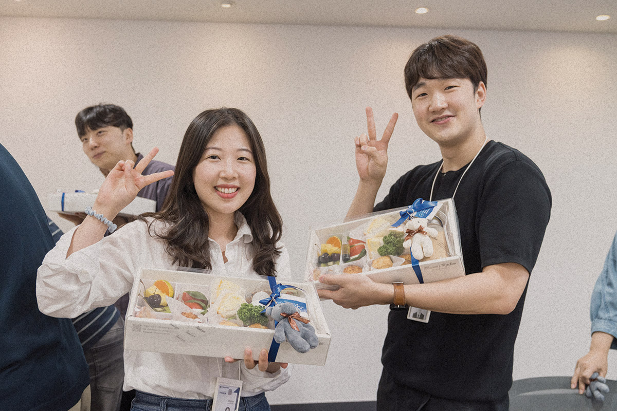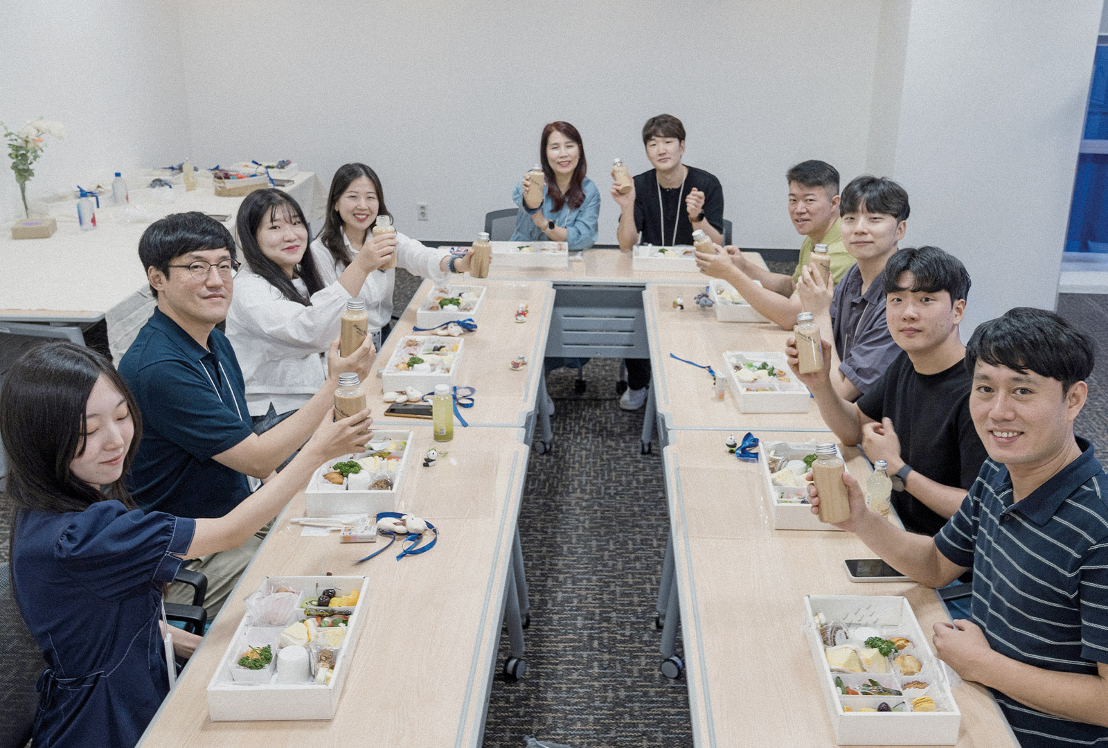 혁신조직의 활동 마무리를 앞두고 구성원들은 서로 격려하고 마음을 공유하는 특별한 시간을 가졌다. 온몸이 나른해지는 오후, 달콤한 디저트 박스를 함께 즐긴 것. 구움과자와 쿠키, 과일, 샐러드, 밀크티 등을 함께 먹으며 담소를 나누는 등 테이블에 둘러앉아 소소한 즐거움을 누렸다. 혁신조직이 지향하는 지점이 바로 이것이다.